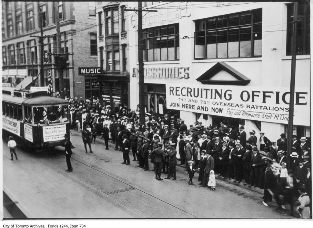 Later, in early August 1918, what would be dubbed the Toronto Anti-Greek Riots broke out. It raged for three days and to this day is the largest riot in the city’s history. It began on a hot summer weekend when many veterans descended on the city for the first-ever national congress of the Great War Veterans Association, with grievances of returned soldiers a main topic of discussion. When a disabled soldier was denied service at the Greek-owned White Star Café on Yonge Street for being drunk and abusive to staff, he was removed and police were called. This area was home to a veteran’s hospital and many boarding houses in which returned soldiers lived. Tensions had already existed there, as a number of Toronto’s Greek immigrant population refused to join the Canadian forces due to their home country being officially neutral, fearing a scenario where they would be interned or have to fight their own countrymen if Greece joined the Central Powers. However many Toronto Greeks did serve, and Greece did join the Allies after all in mid-1917. Many of the local Greek business owners contributed regularly to the Patriotic Fund.