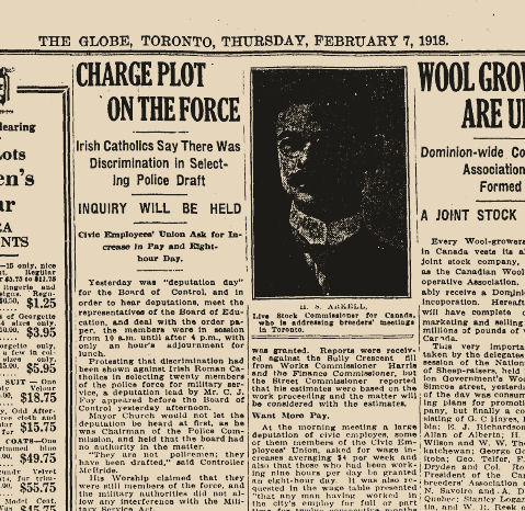 Due to the mounting losses overseas, the Canadian government enacted the Military Service Act towards the end of 1917, allowing for conscription of military-aged men. While at first it seemed the police force was an essential occupation, it too would have to provide a list of names of eligible men “most easily spared”, from which twenty would be drafted. When screening out officers who were sole providers for their families, had medical conditions or were over-age, had siblings killed or wounded overseas, or other considerations, this left about 40 officers to choose from. A scandal soon erupted in the religiously divided city of the time. Constables of Irish Catholic backgrounds alleged in the newspapers that the list of names forwarded was overwhelmingly Catholic, though they only made up a small percentage of the largely Protestant police force. Constable James Lee, who had already been granted an exemption by the military tribunal, even had his exemption papers seized by a Deputy Chief in order to be named to the list of available men. Tempers flared over the sectarian problems in the department. A Board of Inquiry was to be established, but cooler heads prevailed, and only 5 of the 18 men on the force’s final list who would eventually called to serve were of the Catholic denomination.