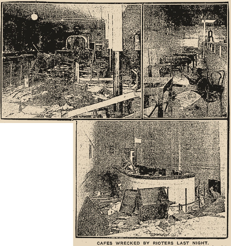 None of this mattered to the angry mob of soldiers who gathered and destroyed the business after hearing about the incident. The group of soldiers and sympathetic civilians continued to grow into hundreds, and later thousands, and went on to attack the many other Greek-owned restaurants downtown. The police attempted to disperse the crowds but believed the military police had jurisdiction over their soldiers and asked for help which never came. Many businesses were destroyed and the police were under scrutiny in the press for their ineffective response.