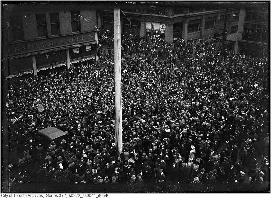 At 11 o’clock on the 11th day of the 11th month – November 11th, 1918, church bells rang out and newsboys sang headlines of an Armistice. The guns in Europe fell silent and the war was over. Canada and her Allies were victorious. Crowds packed the streets shoulder-to-shoulder, and Chief Grasett observed: “The armistice was celebrated with great rejoicing by the entire population, whose behavior in the streets was admirable, giving the police little trouble with the good natured crowds who did not go home till well on through the night.” Police and citizens celebrated openly in the streets and breathed a collective sigh of relief.