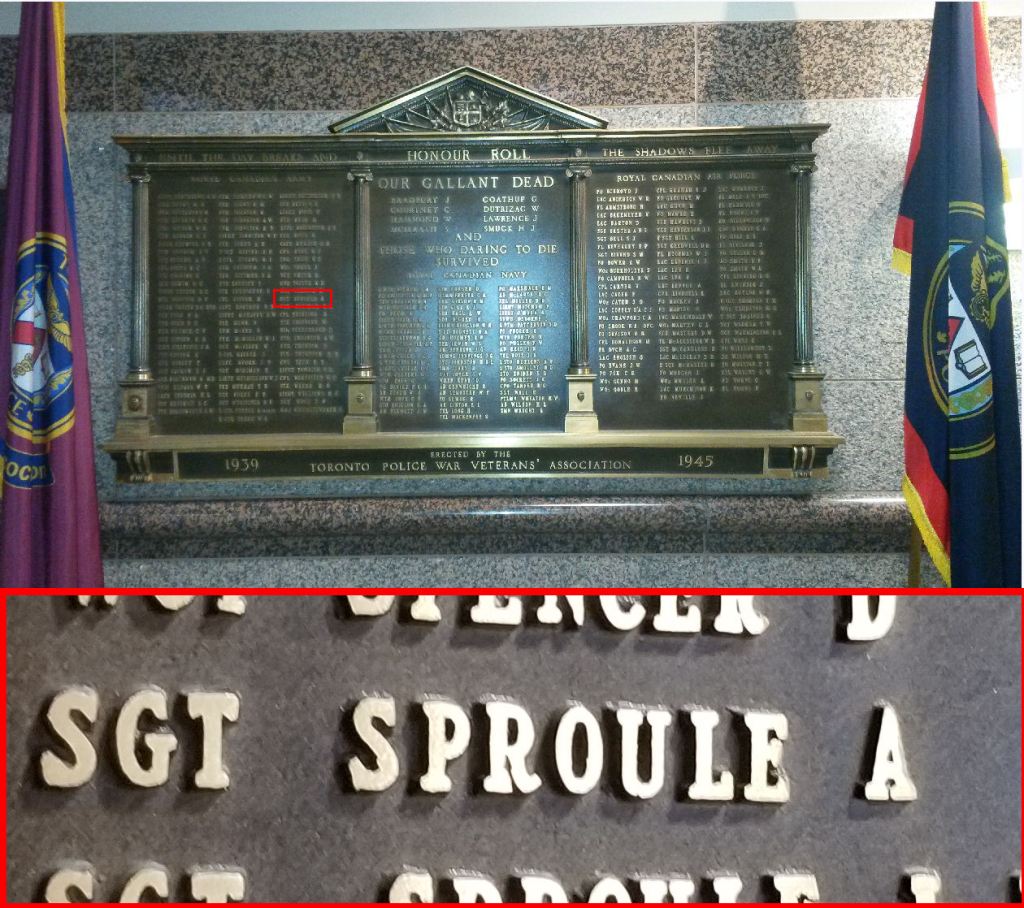 Sergeant of Detectives Alvin Sproule’s name on the Second World War memorial tablet at Toronto Police Headquarters.