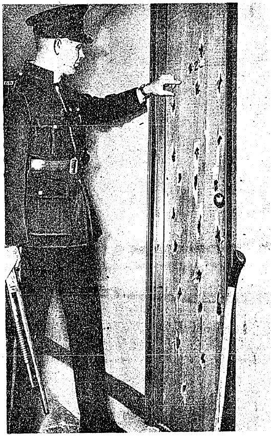PC Lister, also a war veteran, shows Room 411’s bullet-riddled door to photographers. (Toronto Daily Star)