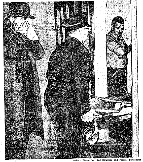 Borg’s body is taken away, as Inspector Matthews wipes his eyes with a handkerchief due to the tear gas. (Toronto Daily Star)