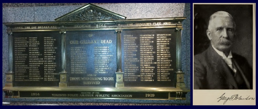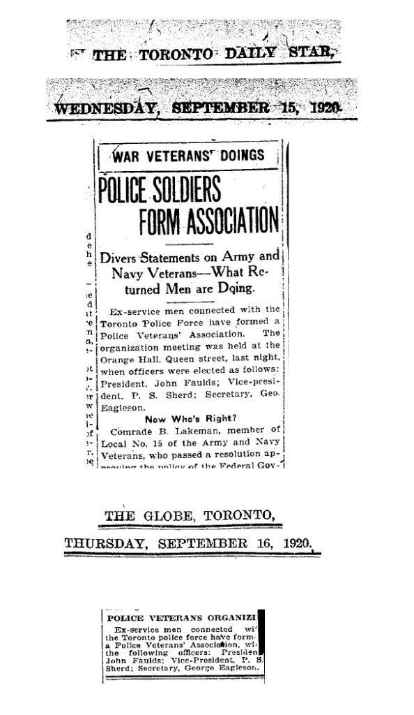 Toronto Public Library – Historical Newspapers Database. Toronto Daily Star 1916-01-26 “Policemen Don Khaki for Blue”; The Globe 1919-09-09 “Police Board Honor Heroes”; The Globe 1927-03-25 “Suggest Memorial for Police Soldiers”; The Globe and Mail 1938-09-01 “New Police Chief”