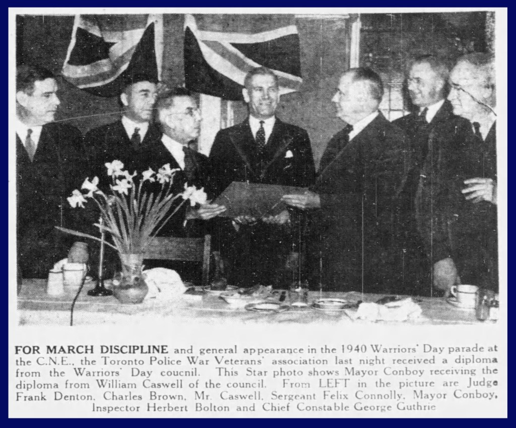 In those early years, the Canadian National Exhibition was in the practice of awarding “diplomas” as award certificates for exhibition categories such as Backyard Garden and Poultry and everything in between. In February 1941, the Warriors’ Day Council presented one such CNE Diploma to Mayor F.J. Conboy and TPWVA President Felix Connolly, won by the 117-strong contingent dubbed the Toronto Police War Veterans Special Squad for their “march discipline and general appearance” on parade during the 1940 Warriors’ Day Parade. It was to be the first Warriors’ Day award of many in years to come for the Association.