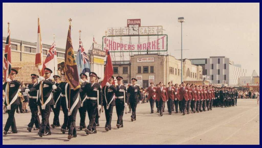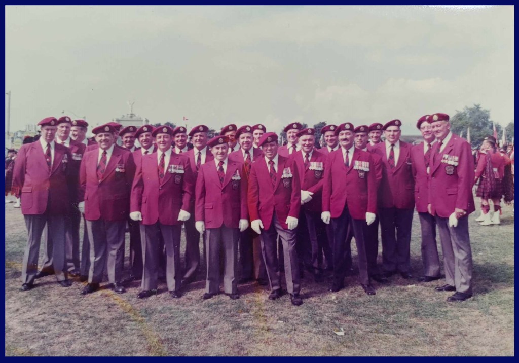 The uniform is familiar to many of that era and consisted of a brass version of the normally silver MTP cap badge (and marked “WVA” in place of the badge number) on a maroon beret, a maroon blazer with the MTPWVA crest, and a tie – originally Red Ross tartan, later a custom MTPWVA “Regimental” tie – and gray slacks. The colour chosen is believed to be due to the close and friendly association with the 1st Canadian Parachute Battalion Association, of which many prominent MTPWVA members were a part at the time – men like Alex Greenaway, Andy Anderson and formerly, Frederick Topham VC. It appears those who would parade in the Association’s marching uniform were retired members, while active members still paraded in police uniform of the day. The MTPWVA contingent would be so sizeable that there were multiple platoons and a colour party. Adding to this Colour Party was another change – the Association now had its own Association Flag, referred to as its Colours, which would be proudly carried by the left marker.