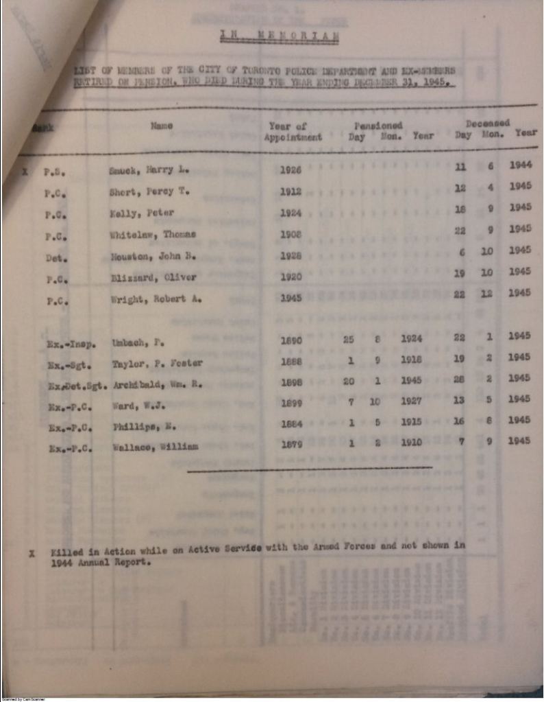- D. Draper – Annual Report of the Chief Constable of the City of Toronto for the Year 1945, “In Memoriam” page. Toronto: The Carswell Co Ltd City Printers, 1946.