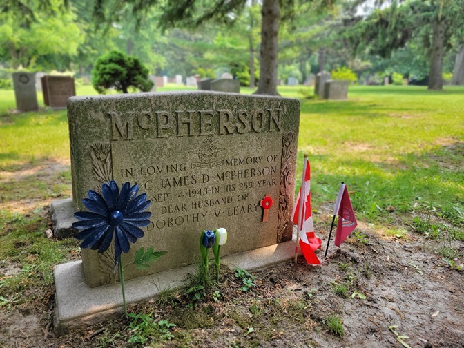 On September 4th, 1943, McPherson took off on a training flight with an instructor pilot. While flying southeast of the airbase, McPherson’s plane struck hydro lines and crashed into the Sixth Nation River, one mile north of Riceville. A local farmer witnessed the crash and attempted to save the men, but the water was too deep – McPherson and his instructor drowned.