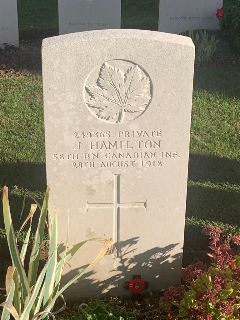 Constable James Hamilton lies buried at Vis-En-Artois British Cemetery in Haucourt, France.