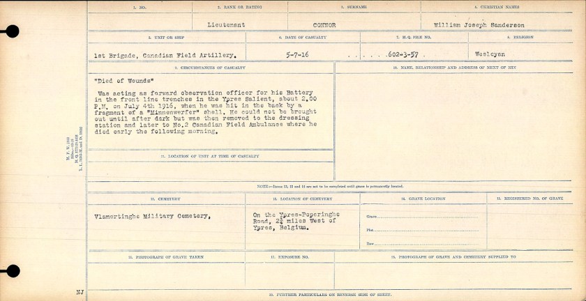 Connor was then engaged in training soldiers in England before returning to the front as an officer in the 4th Battery, 1st Brigade, Canadian Field Artillery. By early July 1916, the 4th Battery was in the Culvert Position of the Ypres salient, where “the least activity on the position brought upon us an HE [High Explosive] storm.” On July 4th 1916, Connor was in front line trenches acting as a Forward Observation Officer directing his battery’s artillery fire onto the enemy. Later in the day, Connor was severely wounded by an enemy mortar and evacuated to a field ambulance. He died the following day, Wednesday, July 5th 1916.