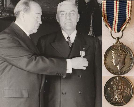 Retired Patrol Sgt. H.E. Scott being presented with the King’s Police and Fire Services Medal for Gallantry. At right, a close up of a KPFSM medal.
