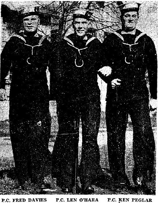 Constables Frederick Davies (#284), Leonard O’Hara (#55) and Kenneth Peglar (#108) in their Royal Canadian Navy uniforms, as they appeared in a 1942 edition of the Toronto Daily Star