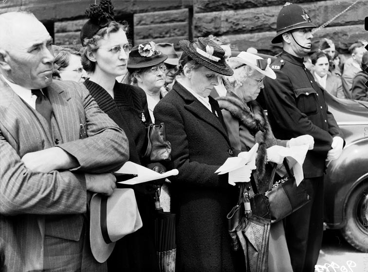A Toronto Police constable stands with citizens during an impromptu D-Day prayer service at Old City Hall (City of Toronto Archives, Fonds 1266 Item 90982)