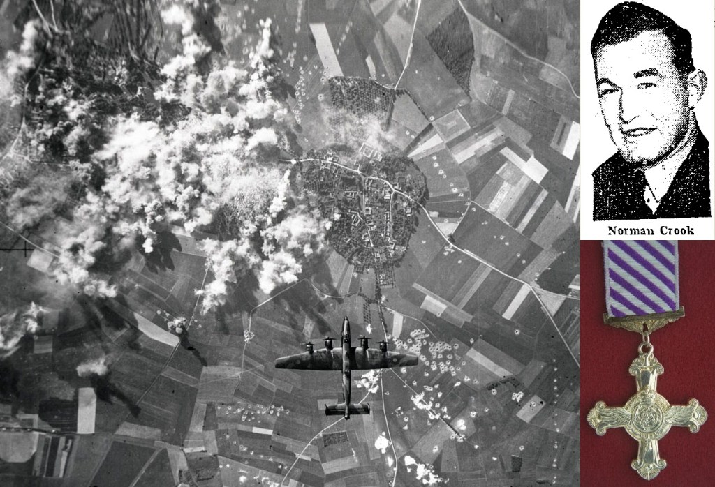 Crook’s action that night would later be recognized by the second highest award of bravery an airman could receive. His recommendation read, in part: “ …when attacking Metz his aircraft was attacked three times by fighters and was very severely damaged. So much so that two members of the crew abandoned on order of the Captain, and the aircraft lost 7,000 feet before control was regained. At that time the port outer engine cut so the bomb load was jettisoned and a course set for England. Pilot Officer Crook cooly and skilfully navigated his damaged aircraft back to a diversion base, avoiding the heavily defended areas en route, and a high-speed landing was made at an emergency landing field.” For this action and his overall flying record, he would receive the Distinguished Flying Cross.