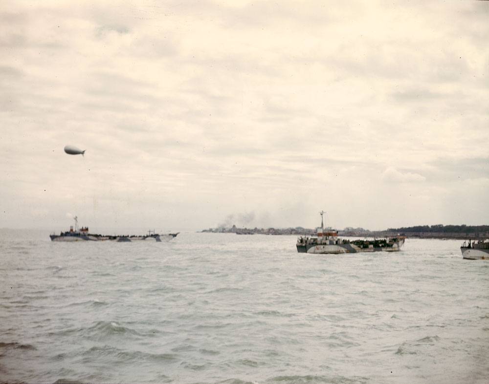 A rare colour photo of special Tank Landing Craft moving toward Juno Beach on D-Day. Patrol Sergeant H.L. Smuck came ashore aboard these ships (Library and Archives Canada)